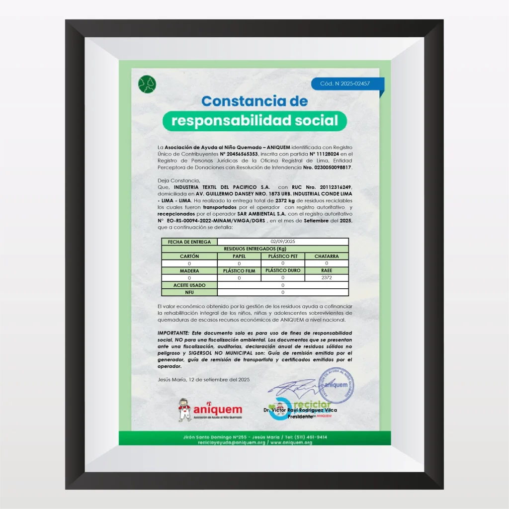 Donamos nuestros residuos electrónicos (RAEE) a ANIQUEM (Asociación de Ayuda a Niños Quemados) con el fin de transformar estos materiales en valiosos recursos que ayudan a financiar terapias y artículos de apoyo para niños que han sufrido quemaduras. Aportamos más de 2000 kg de RAEE, contribuyendo a recuperar componentes que, mediante el reciclaje, adquieren una nueva utilidad y siguen generando un impacto positivo.